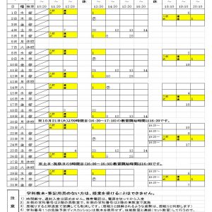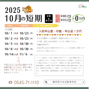 10月の学科計画表です。 入校される方は最初に入校説明、運転適性検査、学科1を受けていただきます。 入校ご希望の方は入校説明の前に視力検査、写真撮影を行わせて頂きます。 入校日、火曜日曜は10:00くらいにはお越しくださ […]