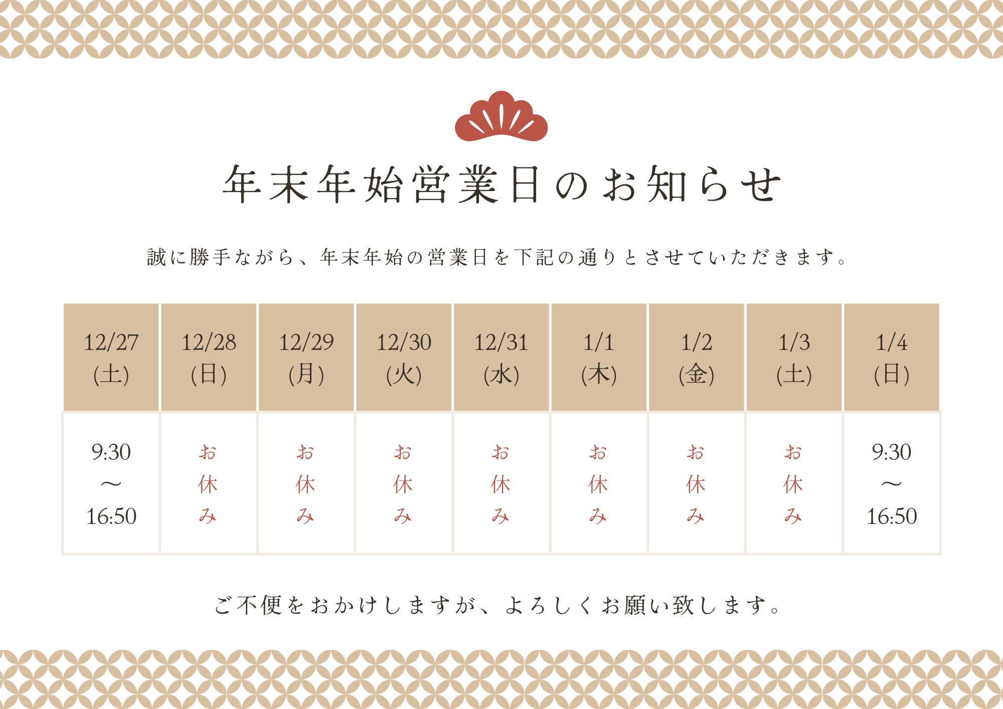 年末年始営業日のお知らせ